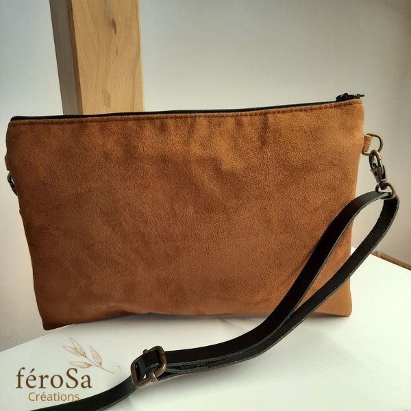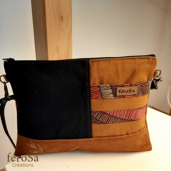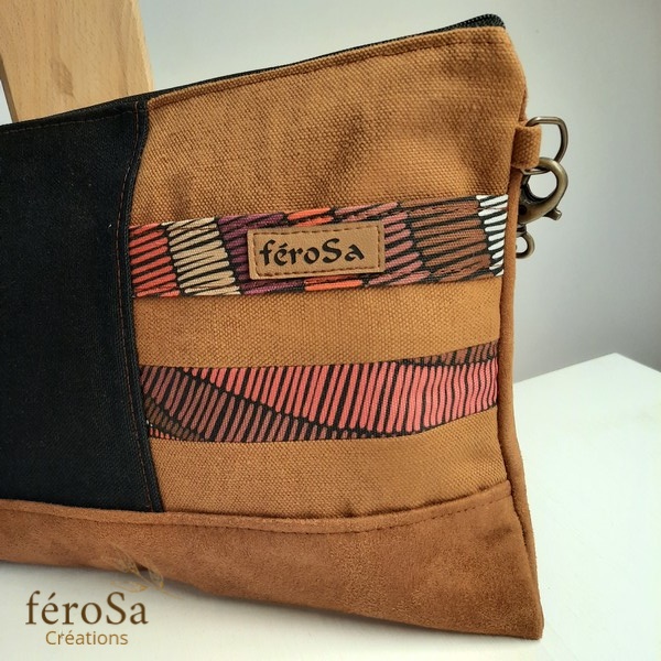 Pochette en suédine marron et tissus en coton marron et noir orné d’un tissus imprimé