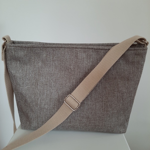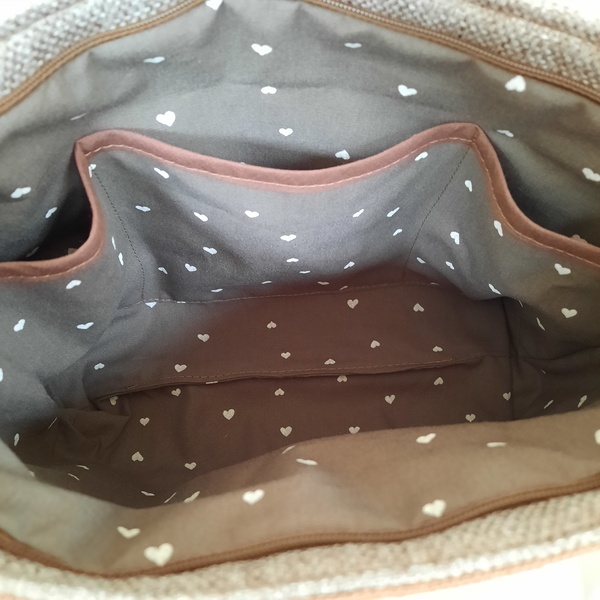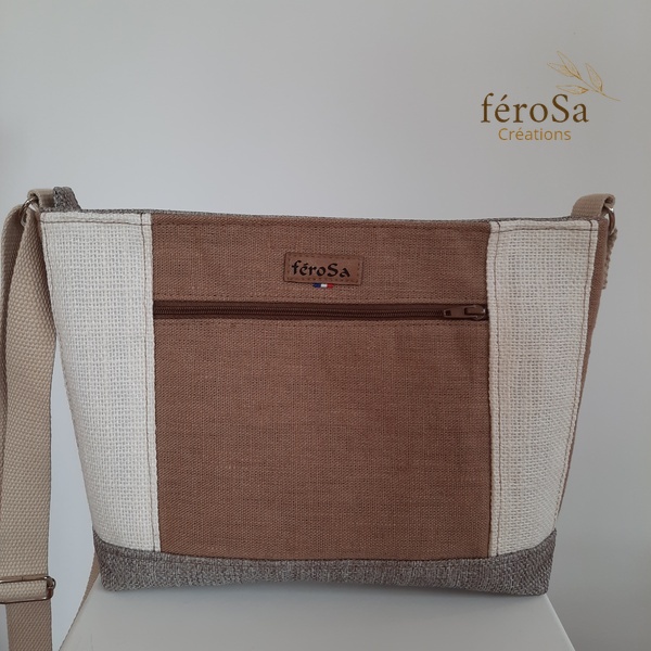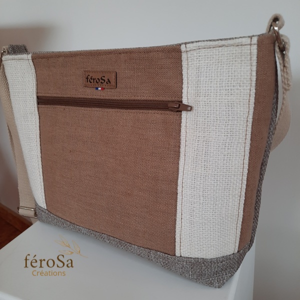 Sac bandoulière en tissus épais beige chiné, tissus lin Camel et deux bandes de toile de jute blanc cassé sur les cotés . Une poche zippée sur le devant du sac et trois poches à l’intérieur. Tissus intérieur imprimé cœurs. Le sac se ferme avec un zip. Sangle en coton beige réglable.