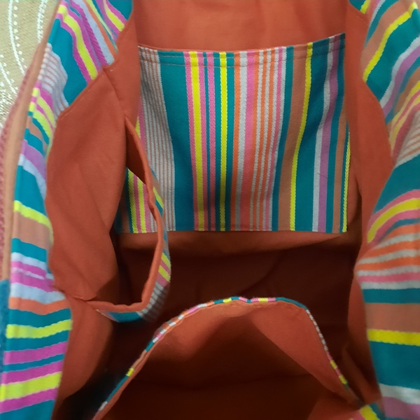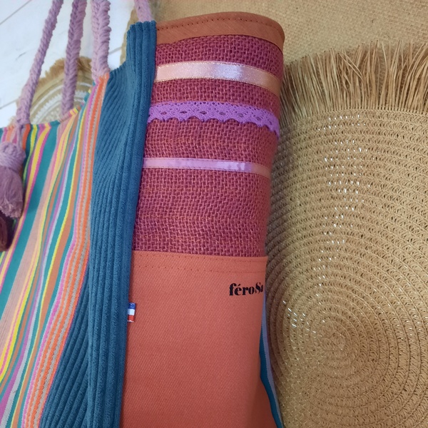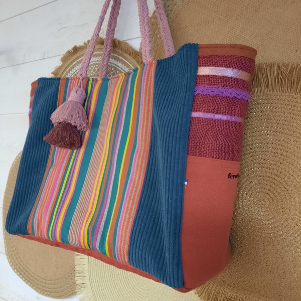 Deux bandes de tissus velours vert et un tissus rayé multicolore sur le devant du sac cabas. Les cotés du sac cabas sont en toile de jute et les poches en coton de couleur brique. Trois bandes de rubans viennent décorer le haut des cotés du sac cabas.