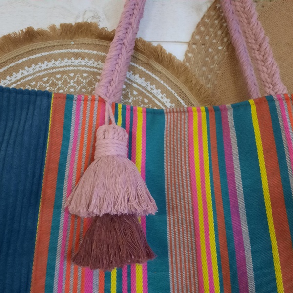 Le sac cabas se ferme avec un aimant et a deux anses en coton tressés (macramé ) rose poudré et ornés de deux jolies pompons.